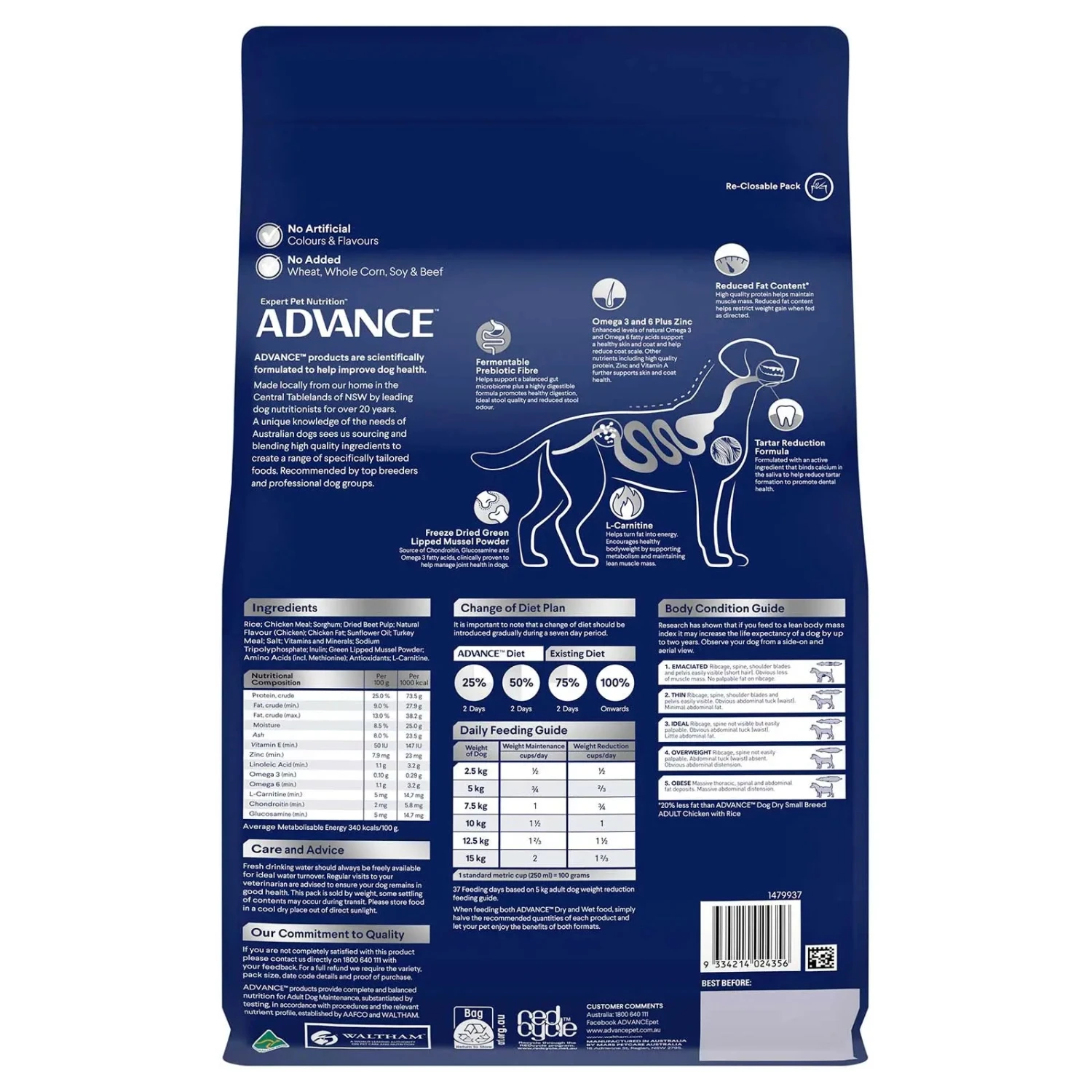 Advance Weight Control Toy/Small Breed Dry Dog Food – Chicken is an Australian made super premium food for dogs with select natural ingredients. Formulated so that your dog maintains a complete and balanced vitamin/mineral intake whilst consuming fewer calories. Also contains nutrients to support dental health, digestive health, immune health and a healthy skin and shiny coat.