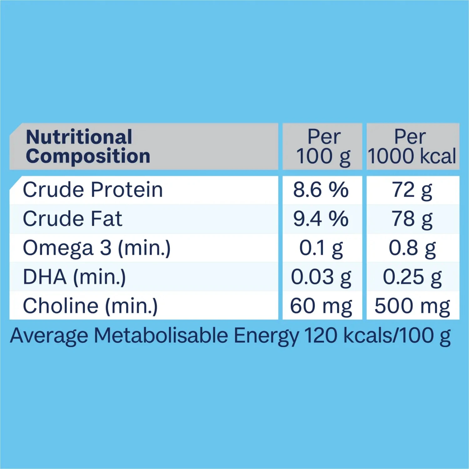 Ingredients: Chicken; Lamb; Rice; Minerals; Gelling Agents; Vegetable oil; Fish oil; Vegetable Fibre; Vitamins; Taurine; Antioxidants.