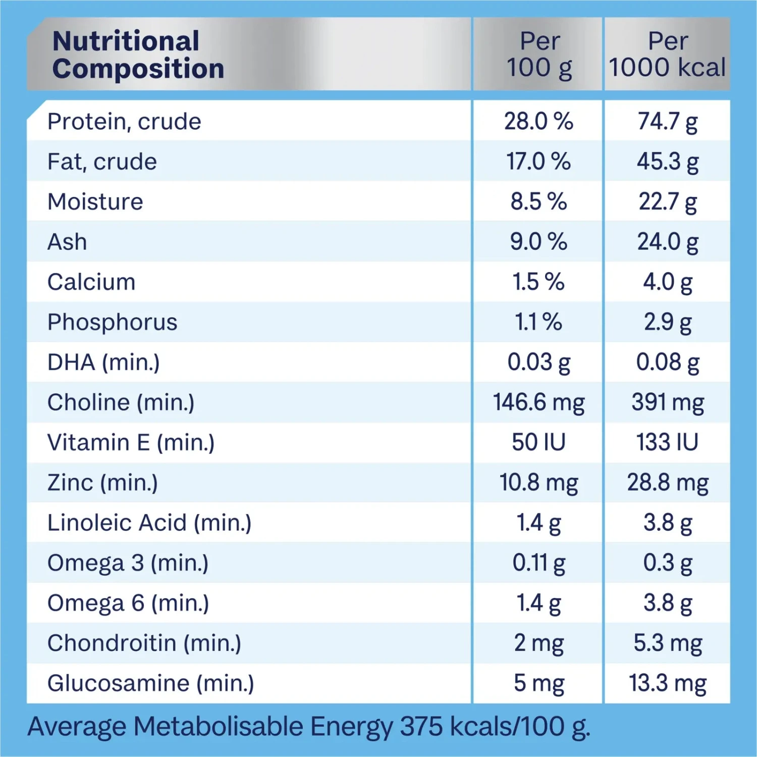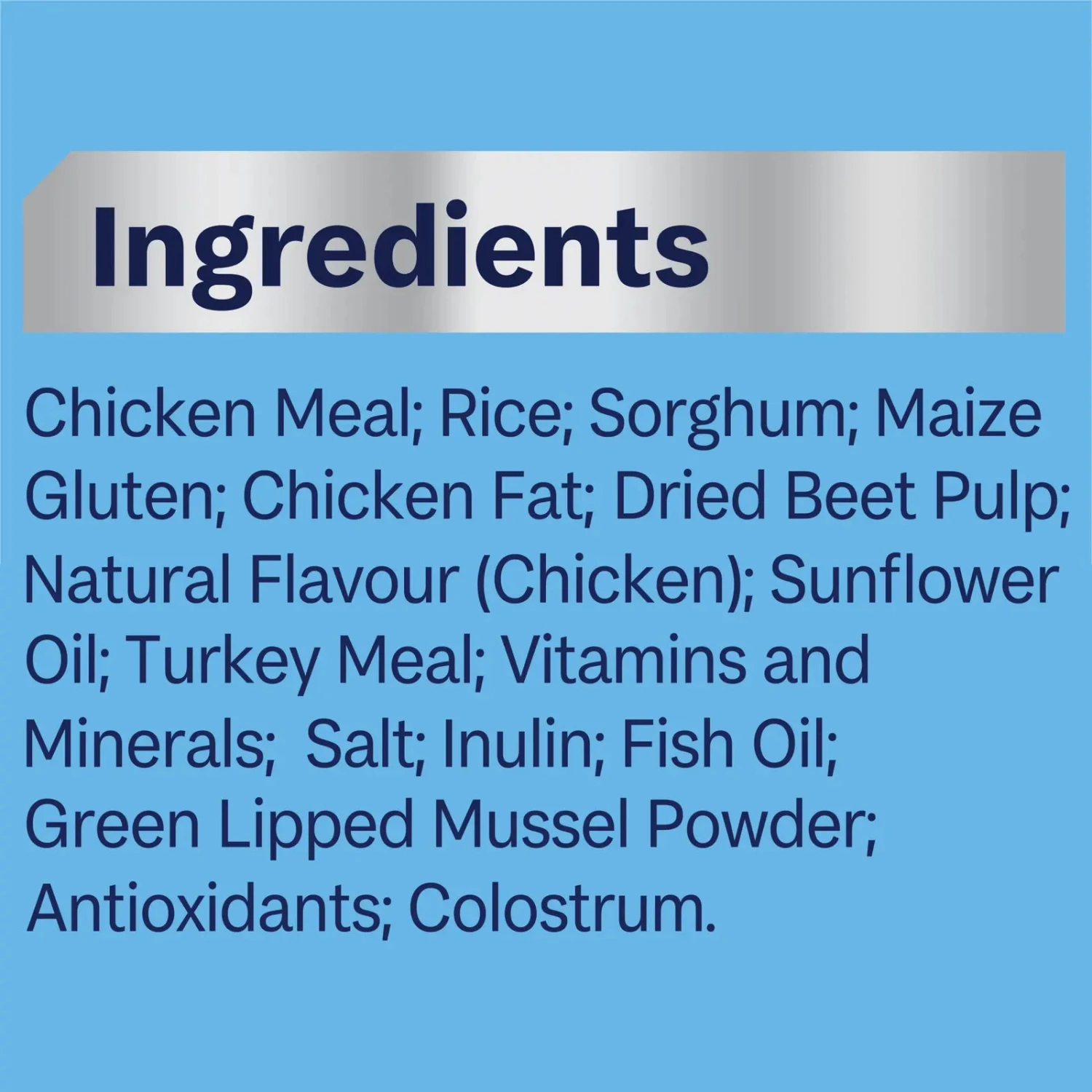 Chicken Meal, Rice, Maize Gluten, Chicken Fat, Sorghum, Dried Beet Pulp, Sunflower Oil, Natural Flavour (Chicken), Turkey Meal, Minerals, Salt, Inulin, Vitamins, Fish Oil, Green Lipped Mussel Powder, Antioxidants.
