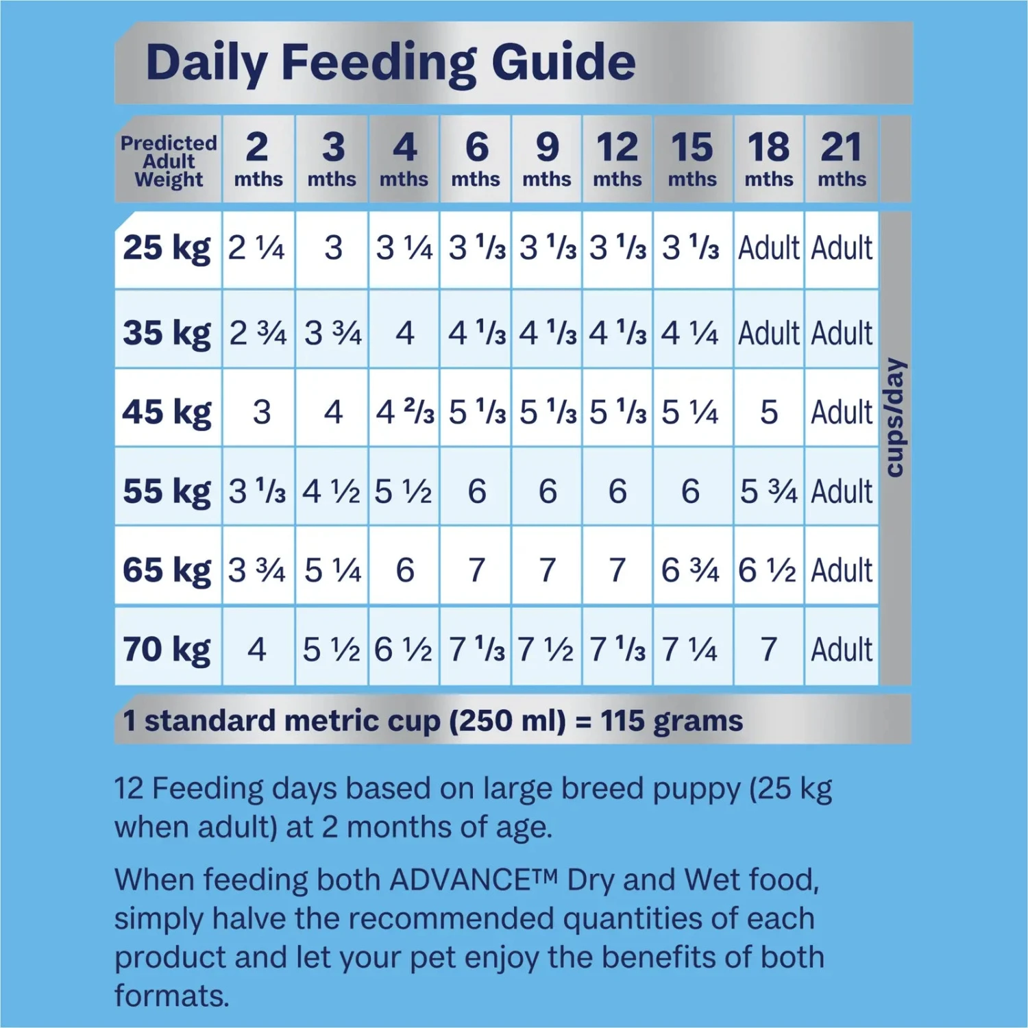 Advance Puppy Growth Large+ Breed Dry Dog Food – Chicken is a super premium food for puppies with select natural ingredients. Specifically designed to achieve a controlled growth rate in large and giant breeds, through optimal calories and calcium/phosphorus ratios. Also contains nutrients to support brain development, immune health, joint health and a healthy skin and shiny coat, Advance is scientifically formulated to help improve dog health.