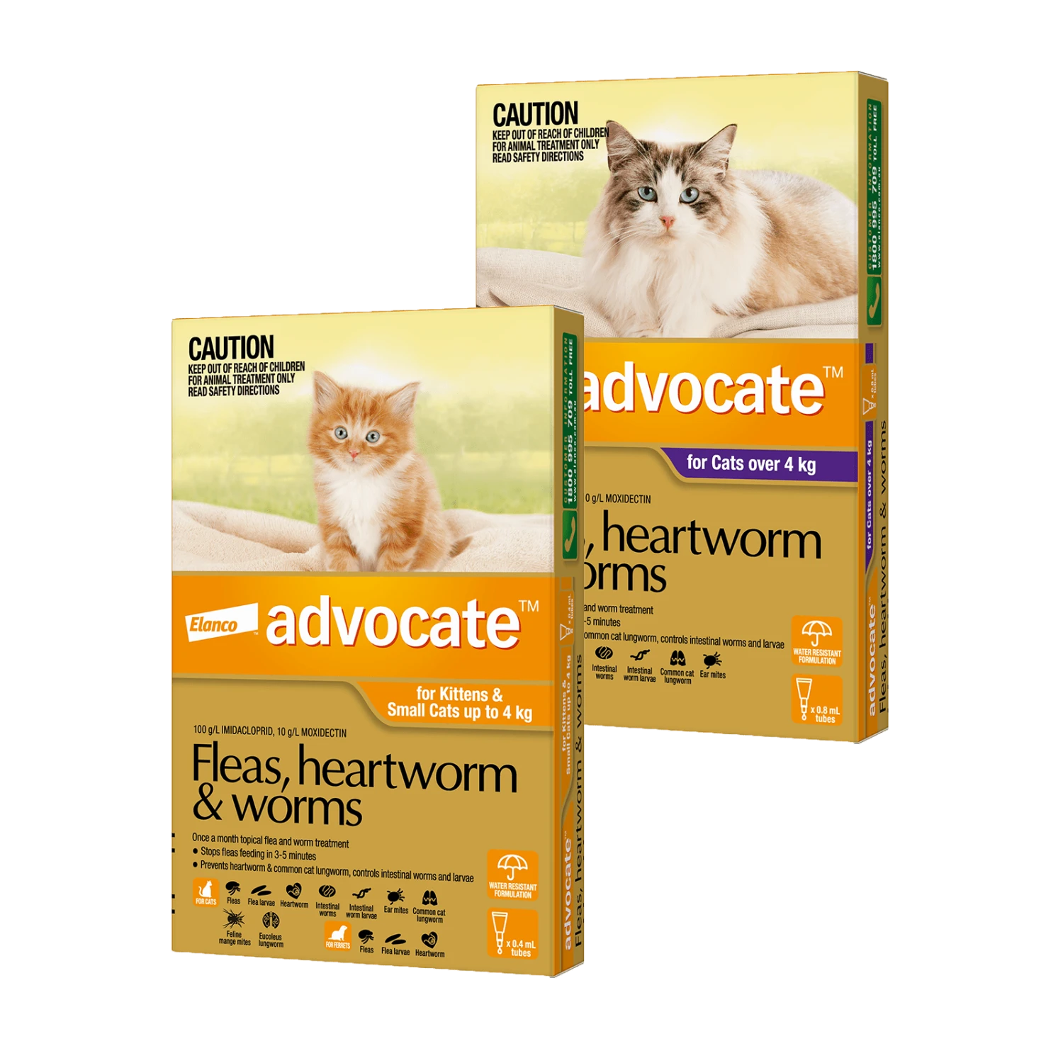 Advocate provides comprehensive parasite protection. A convenient, easy-to-use spot-on, applied monthly. The super ingredients in Advocate provide fast relief from fleas, prevent deadly heartworm disease, and provide ongoing protection from common intestinal worms including adult and immature stages of roundworms and hookworms. Advocate is the only product that protects against both species of lungworms that cause disease in cats. Advocate also kills ear mites and feline mange mites. Unlike most other products, Advocate kills fleas on contact, and stops reinfesting fleas from biting in 3 – 5 minutes, reducing the incidence of Flea Allergy Dermatitis. Advocate is safe for kittens from 9 weeks of age and ferrets weighing 0.8 kg or more. Advocate is also water-resistant.