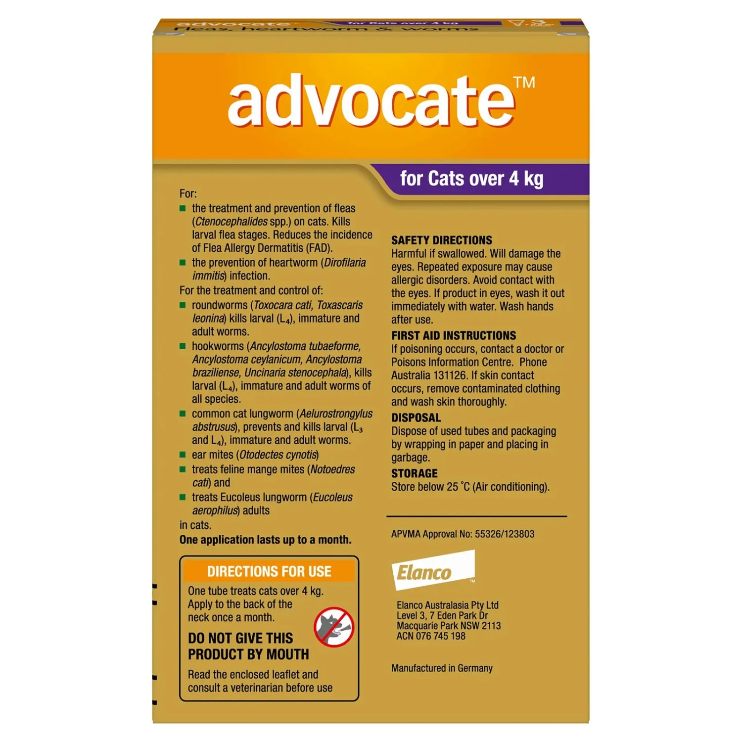 Advocate for Cats provides comprehensive protection from fleas, heartworm, roundworms, hookworms lungworms and mites. An easy to use spot-on applied monthly.