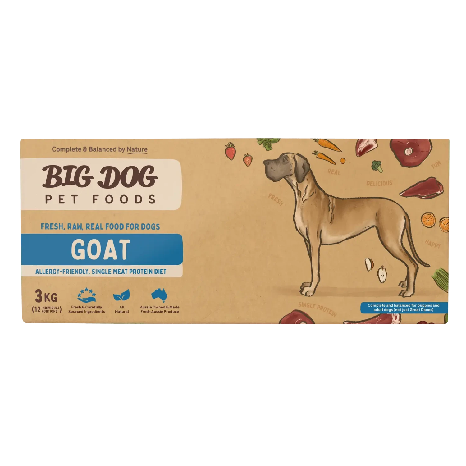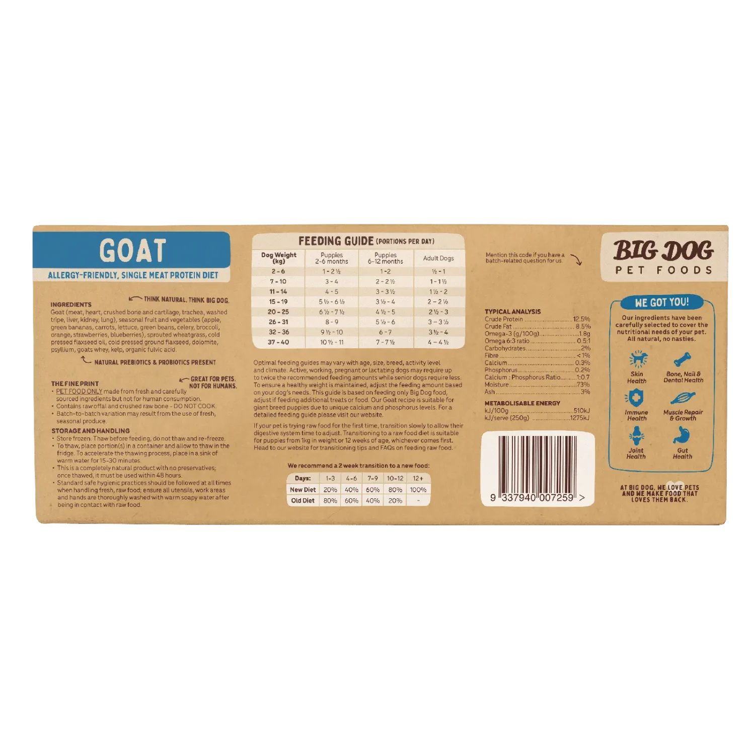 Goat is a high quality source of easily digestible protein for dogs and a great option for dogs who are allergic to other meat proteins. Organic, pasture-fed, Australian goat used in this single-protein diet has had no exposure to environmental chemicals, making it even more suitable for dogs that suffer from allergies. As with all of our diets, this recipe wouldn’t be complete without a balanced blend of nutrient-dense seasonal fruits and vegetables, as well as Big Dog’s special extra ingredients. This recipe includes wheatgrass, cold pressed ground flaxseed, hemp seed powder, whole eggs, kelp, probiotics, prebiotics and garlic for added nutrition and goodness for optimal health and wellbeing.