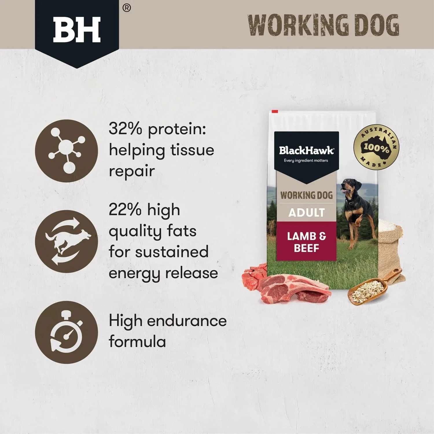 Black Hawk Working Dog Lamb & Beef is our high-endurance formula. High in protein and fat, with 32% real lamb and beef proteins and 22% high quality fats for sustained energy and activity, strong lean muscles as well as healthy joints and coat. Containing lamb and beef, the recipe is rich in zinc and vitamin B12 which aids metabolism and helps boost vitality. Formulated specifically with a balanced carbohydrate blend including rice and oats, Black Hawk Working Dog helps provide the energy needed for those sudden and responsive bursts of speed, throughout the day.