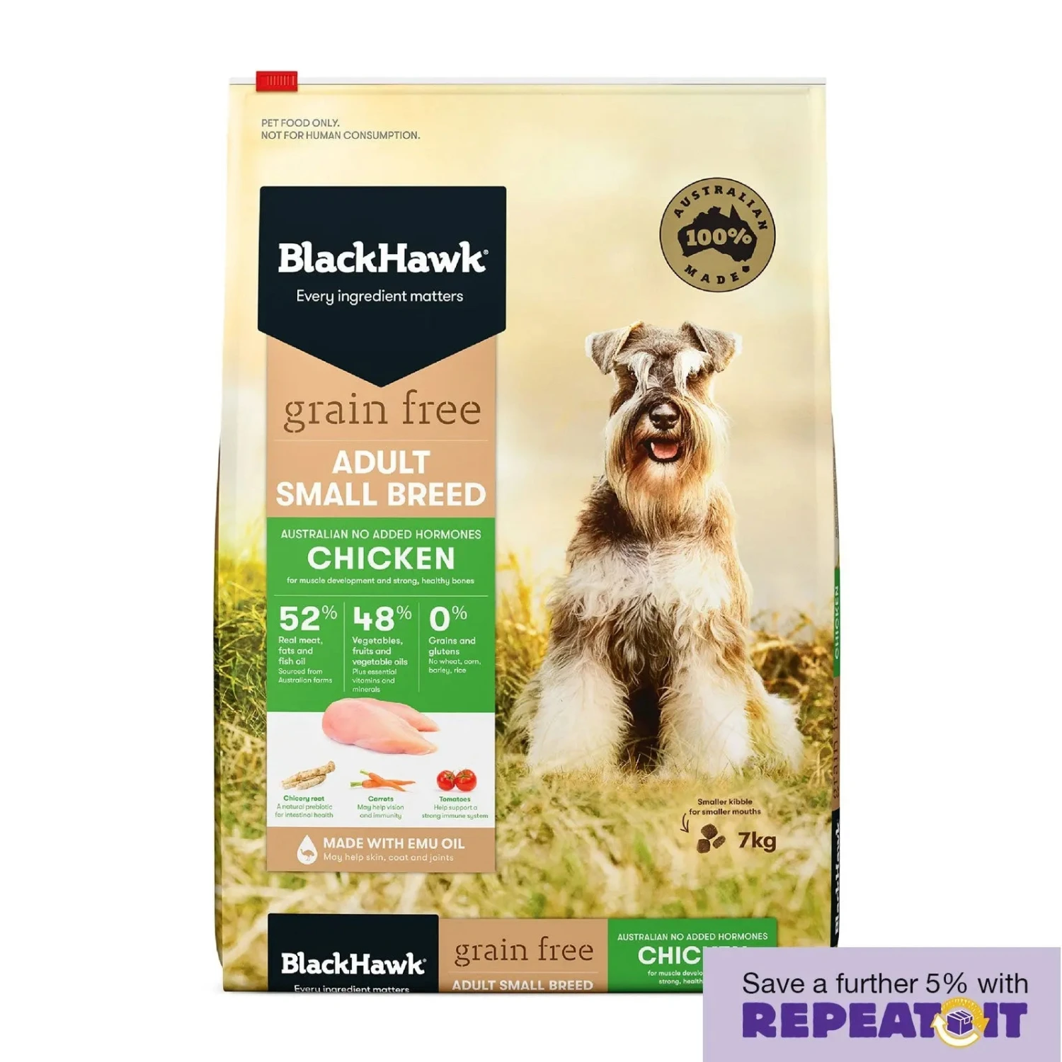 Black Hawk Grain Free Chicken delivers a deliciously lean and highly digestible source of protein packed with amino acids which are essential for building strong muscles. Formulated specifically for small breed dogs with ingredients that matter, like blueberries and cranberries as natural antioxidants which contribute to a healthy immune system, combined with chicory root as a natural prebiotic and other grain-free ingredients to support gut health. This formula is gentle on stomach and skin and provides complete and balanced nutrition for your pet.