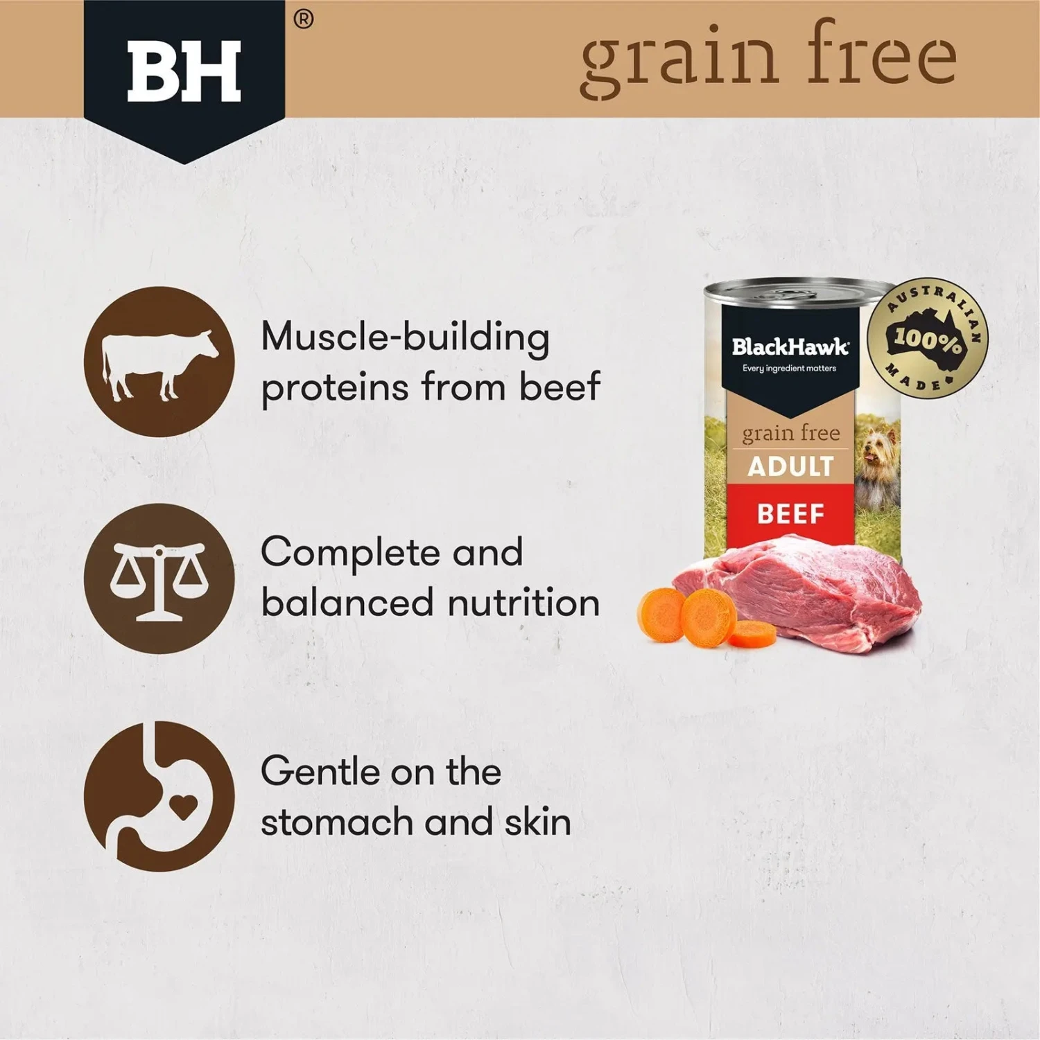 Black Hawk Wet Grain Free Beef delivers a tasty protein which contains amino acids to promote muscle and bone development. Formulated specifically with chondroitin and glucosamine which help to support active joints, it is also gentle on the stomach and skin with non-grain carbohydrates supporting digestive health. The recipe provides complete and balanced nutrition for your pet.
