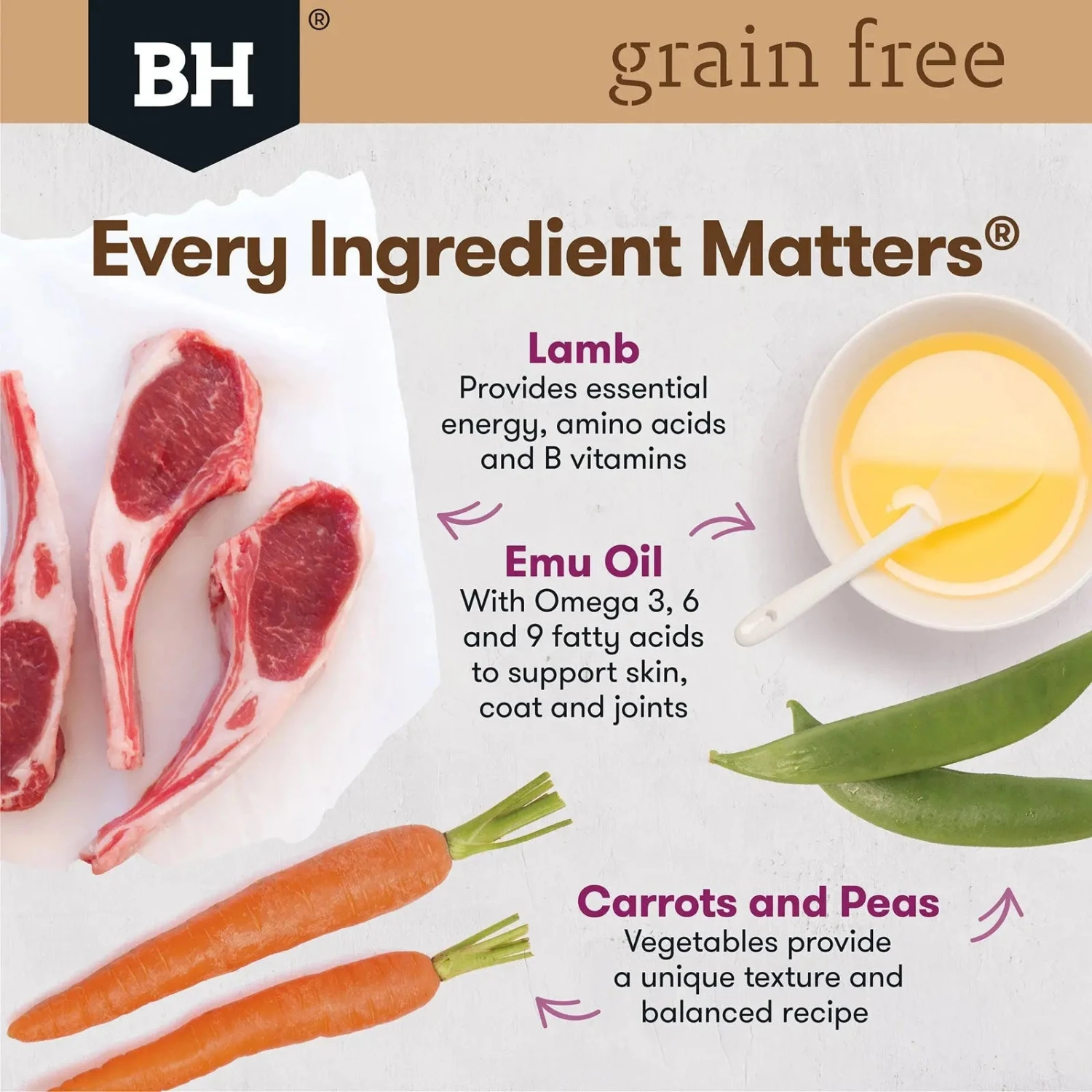 Ingredients:Â Lamb, Chicken, Carrots, Peas, Potato, Gelling Agents, Flavours including Rosemary, Vitamins and Minerals (Choline Chloride, Vitamin E, Pantothenic Acid, Vitamin B1, Vitamin B2, Vitamin B6, Biotin, Vitamin D3, Folic Acid, Vitamin B12, Sodium Tripolyphosphate, Sodium Chloride, Calcium Carbonate, Potassium Chloride, Zinc Sulphate, Magnesium Oxide, Calcium Iodate, Sodium Selenite), Natural Colour, Oils including Emu Oil.