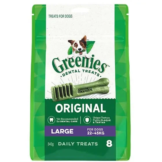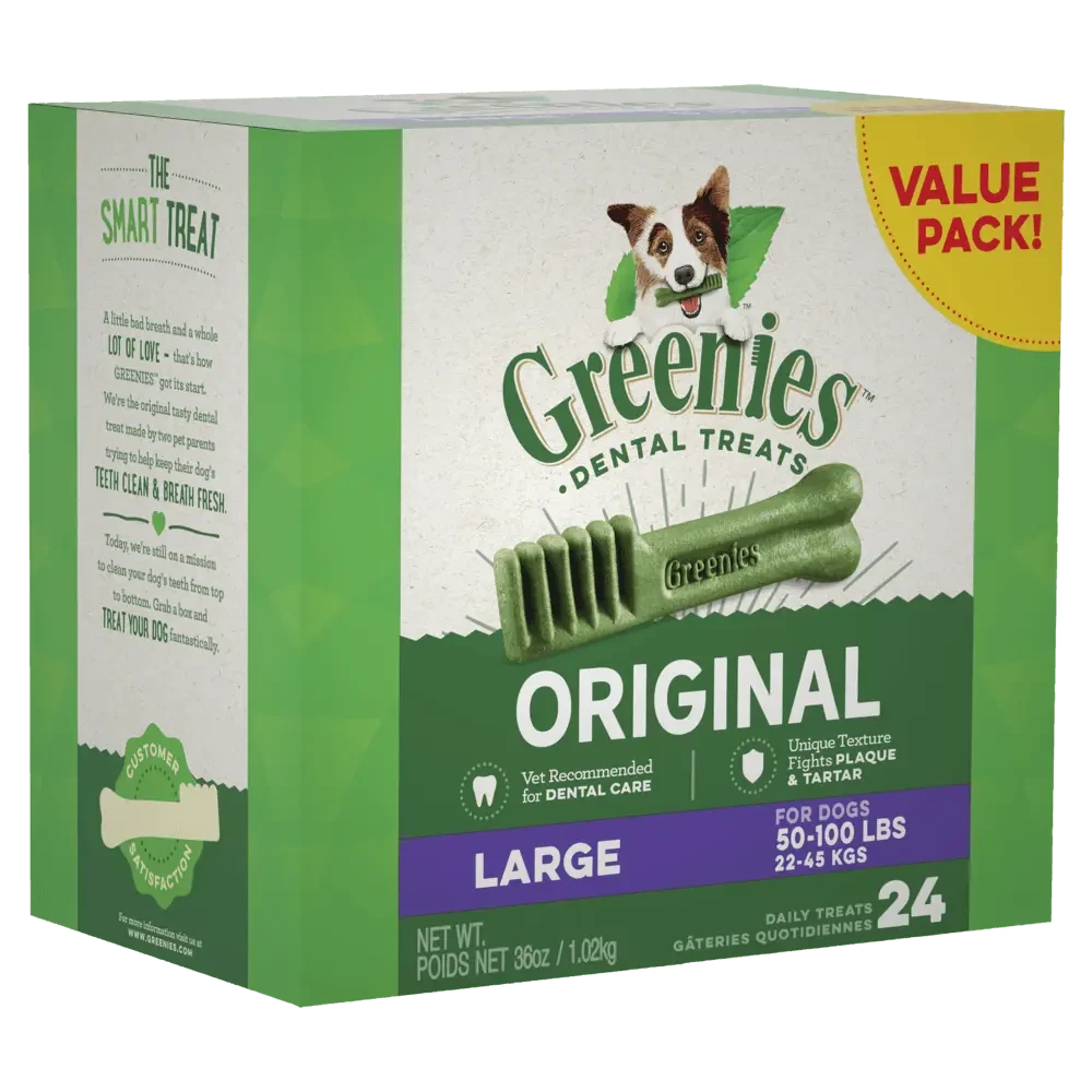 Complete oral care is important for your dog’s total body health and can add years to their lifespan. GREENIES Canine Dental Chews are proven to clean dogs’ teeth by fighting both plaque and tartar buildup, freshening breath, and maintaining healthier teeth and gums. Designed for daily treating, our dental chews are low in fat and nutritionally complete for adult dogs.