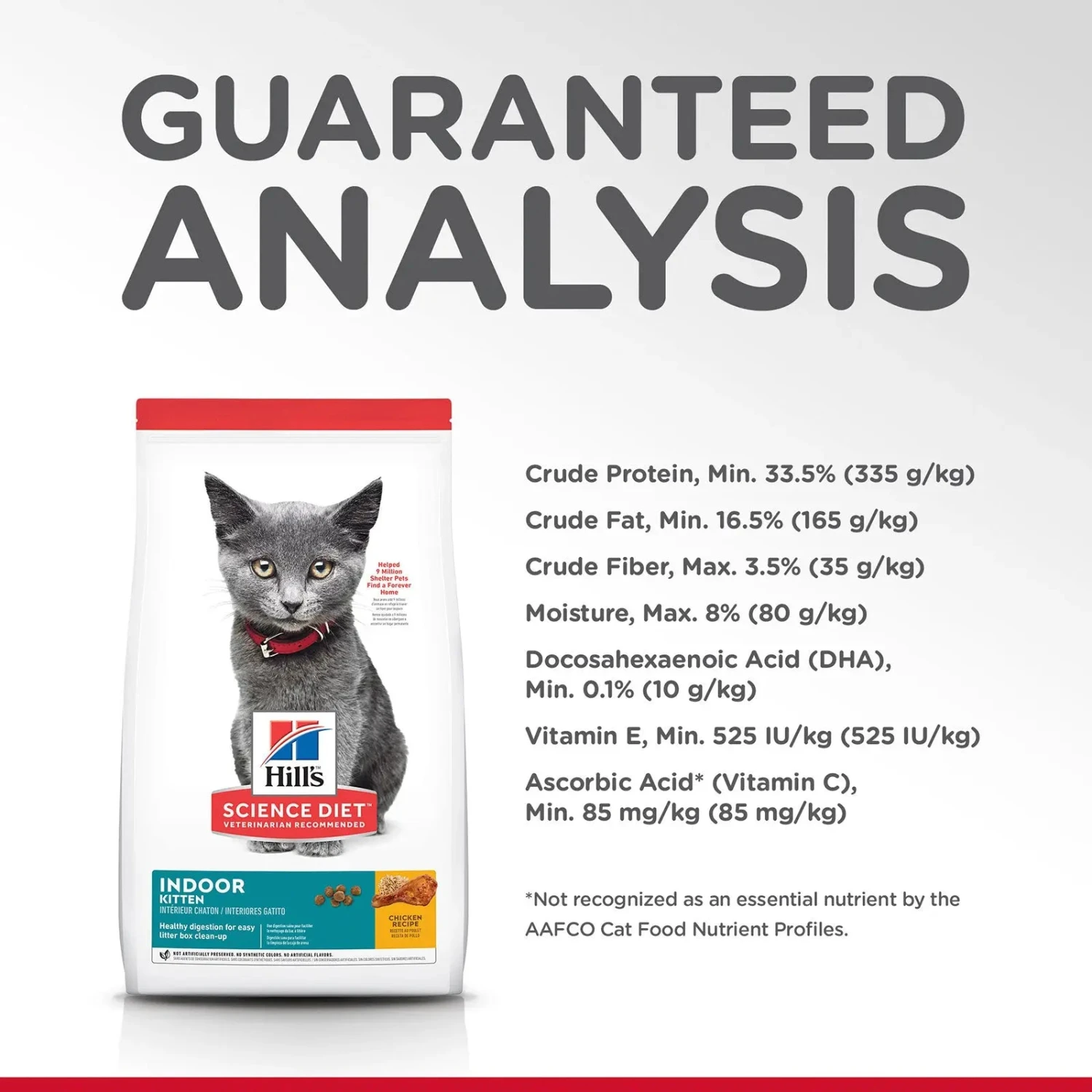 During your cat’s first year of life, you want to feed nutrition that supports everyday health and digestion. Hill’s Science Diet Indoor Kitten dry food is specially formulated to fuel the energy needs of kittens with an indoor lifestyle so they get the best start in life. Made for kittens, this cat food made with natural ingredients uses DHA from fish oil to support brain health and eye development. Balanced minerals promote strong teeth and bones, while natural fibres promote healthy digestion for your young cat, and easier litter box clean-up for you.