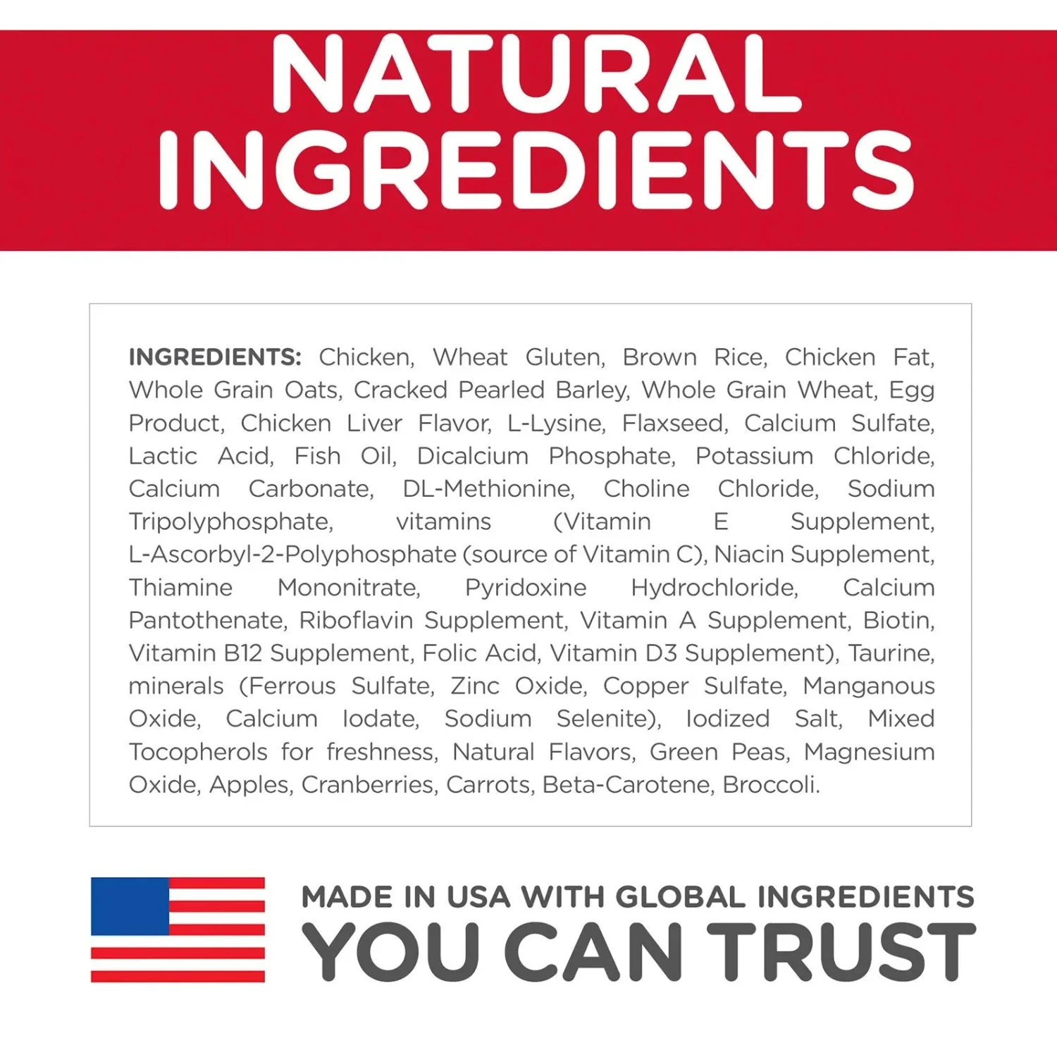 Ingredients: Chicken, Wheat Gluten, Brown Rice, Chicken Fat, Whole Grain Oats, Cracked Pearled Barley, Whole Grain Wheat, Egg Product, Chicken Liver Flavor, L-Lysine, Flaxseed, Calcium Sulfate, Lactic Acid, Fish Oil, Dicalcium Phosphate, Potassium Chloride, Calcium Carbonate, DL-Methionine, Choline Chloride, Sodium Tripolyphosphate, vitamins (Vitamin E Supplement, L-Ascorbyl-2-Polyphosphate (source of Vitamin C), Niacin Supplement, Thiamine Mononitrate, Pyridoxine Hydrochloride, Calcium Pantothenate, Riboflavin Supplement, Vitamin A Supplement, Biotin, Vitamin B12 Supplement, Folic Acid, Vitamin D3 Supplement), Taurine, minerals (Ferrous Sulfate, Zinc Oxide, Copper Sulfate, Manganous Oxide, Calcium Iodate, Sodium Selenite), Iodized Salt, Mixed Tocopherols for freshness, Natural Flavors, Green Peas, Magnesium Oxide, Apples, Cranberries, Carrots, Beta-Carotene, Broccoli.