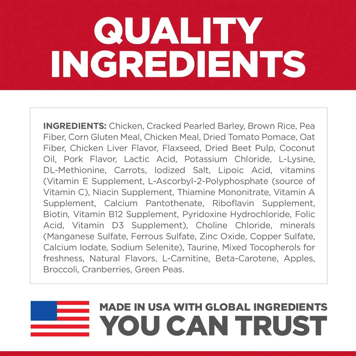 Ingredients: Chicken, Cracked Pearled Barley, Brown Rice, Pea Fiber, Corn Gluten Meal, Chicken Meal, Dried Tomato Pomace, Oat Fiber, Chicken Liver Flavor, Flaxseed, Dried Beet Pulp, Coconut Oil, Pork Liver Flavor, Lactic Acid, Potassium Chloride, L-Lysine, DL-Methionine, Carrots, Iodized Salt, Lipoic Acid, vitamins (Vitamin E Supplement, L-Ascorbyl-2-Polyphosphate (source of Vitamin C), Niacin Supplement, Thiamine Mononitrate, Vitamin A Supplement, Calcium Pantothenate, Riboflavin Supplement, Biotin, Vitamin B12 Supplement, Pyridoxine Hydrochloride, Folic Acid, Vitamin D3 Supplement), Choline Chloride, minerals (Manganese Sulfate, Ferrous Sulfate, Zinc Oxide, Copper Sulfate, Calcium Iodate, Sodium Selenite), Taurine, Mixed Tocopherols for freshness, Natural Flavors, L-Carnitine, Beta-Carotene, Apples, Broccoli, Cranberries, Green Peas.