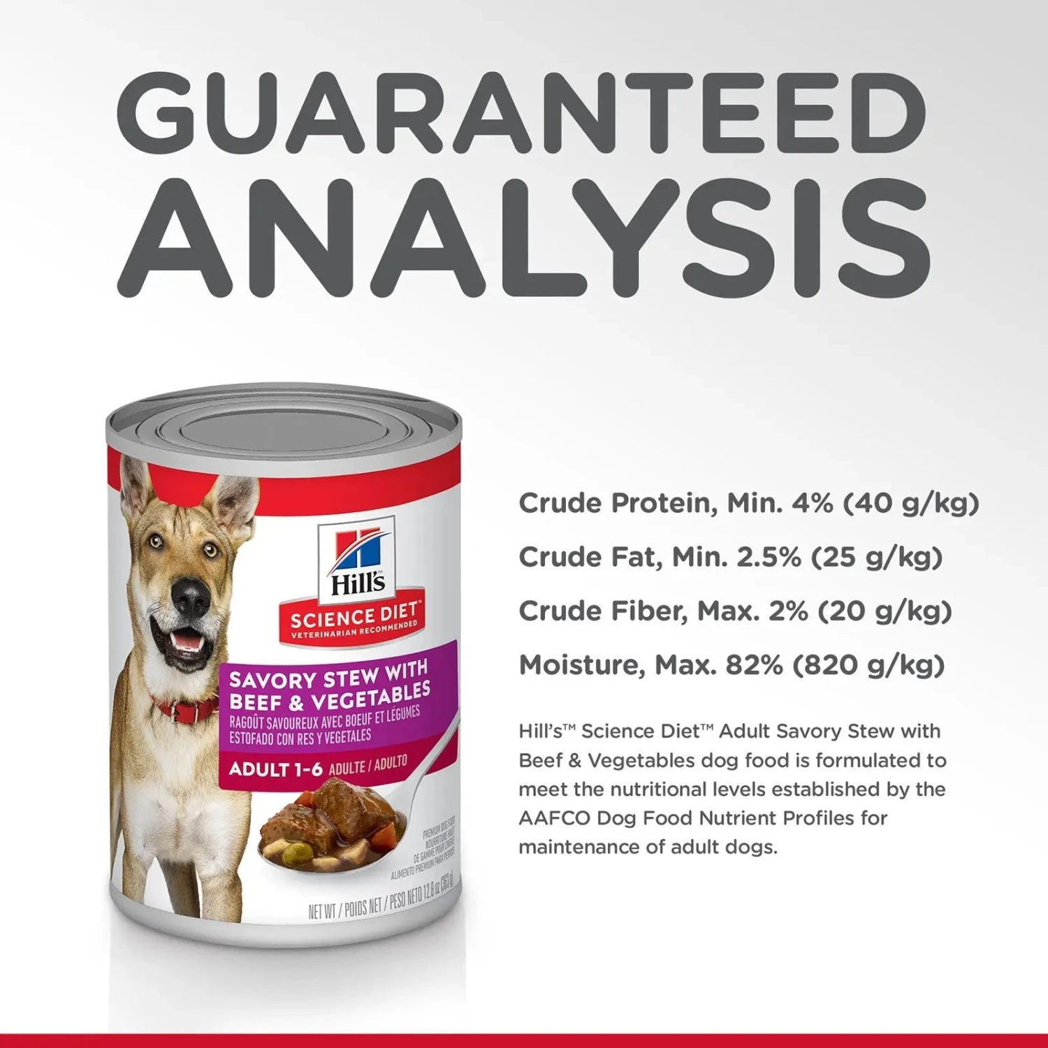 Send your adult dog running to the bowl with a recipe that supports their prime years. Hill’s Science Diet Adult Savory Stew with Beef & Vegetables is a delicious way to provide precisely balanced nutrition that enhances the overall health and wellbeing of your pet. This dog food made with natural ingredients blends real meat, brown rice, and a medley of delectable vegetables including peas and carrots, all smothered in a delicious gravy grown dogs love. The precise balance of key nutrients provides dogs 1–6 years old with quality protein for lean muscles. If you want to keep your doggy happy during the prime years, this recipe is one to try.