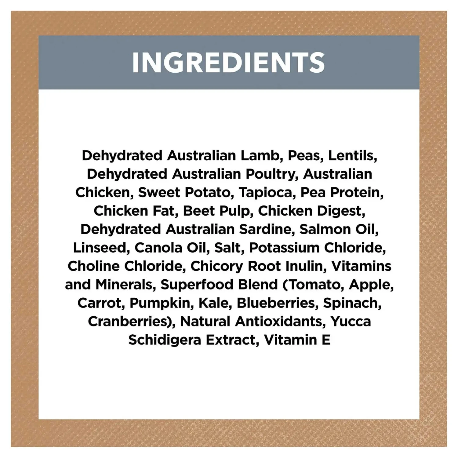 Ingredients: Dehydrated Australian Lamb, Peas, Lentils, Dehydrated Australian Poultry, Australian Chicken, Sweet Potato, Tapioca, Pea Protein, Chicken Fat, Beet Pulp, Chicken Digest, Dehydrated Australian Sardine, Salmon Oil, Linseed, Canola Oil, Salt, Potassium Chloride, Choline Chloride, Chicory Root Inulin, Vitamins and Minerals, Superfood Blend (Tomato, Apple, Carrot, Pumpkin, Kale, Blueberries, Spinach, Cranberries), Natural Antioxidants, Yucca Schidigera Extract, Vitamin E.