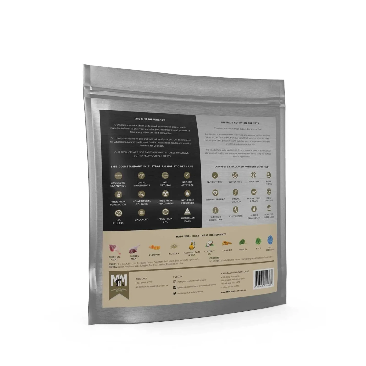 Ingredients: Chicken & Turkey Meat, Pumpkin, Alfalfa, Natural Fats and Oils, Omega 3, 6 & 9, Coconut Oil, Turmeric, Parsley, Kelp, Pre & Probiotics