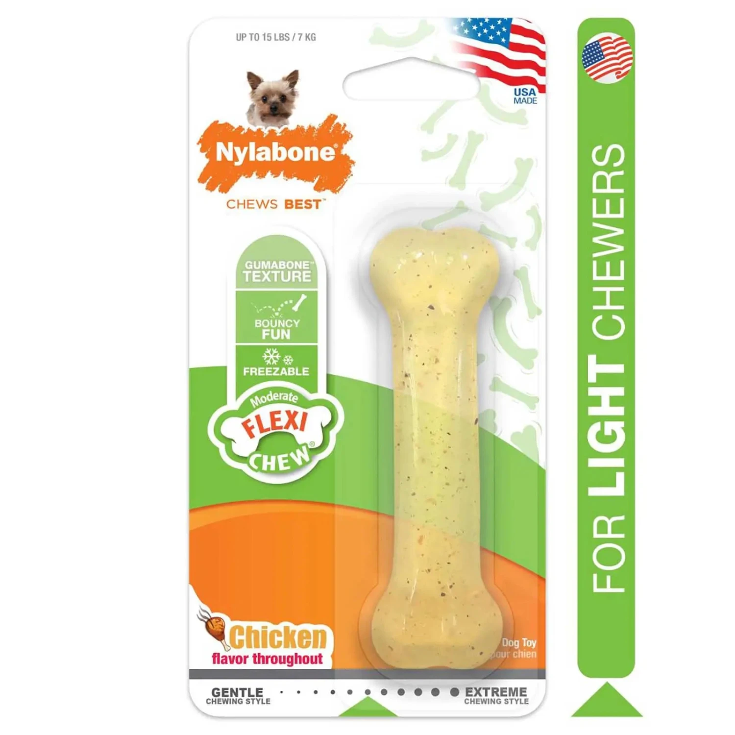 Nylabone Moderate Chew toys are the perfect pastime for your gentle chewer! This chicken chew toy is made with a softer, flexible material that’s easy on dogs’ teeth. It features irresistible chicken flavour throughout, making it a satisfying and occupying way for your dog to relax, avoid destructive chewing, or cope with separation anxiety. Plus, its helps reduce plaque and tartar build up as your dog chews! This Moderate Chew comes in multiple sizes so you can find the perfect soft dog bone for your best friend! This chew toy is not recommended for strong or aggressive chewers. Go ahead and give your dog a Nylabone chew toy!