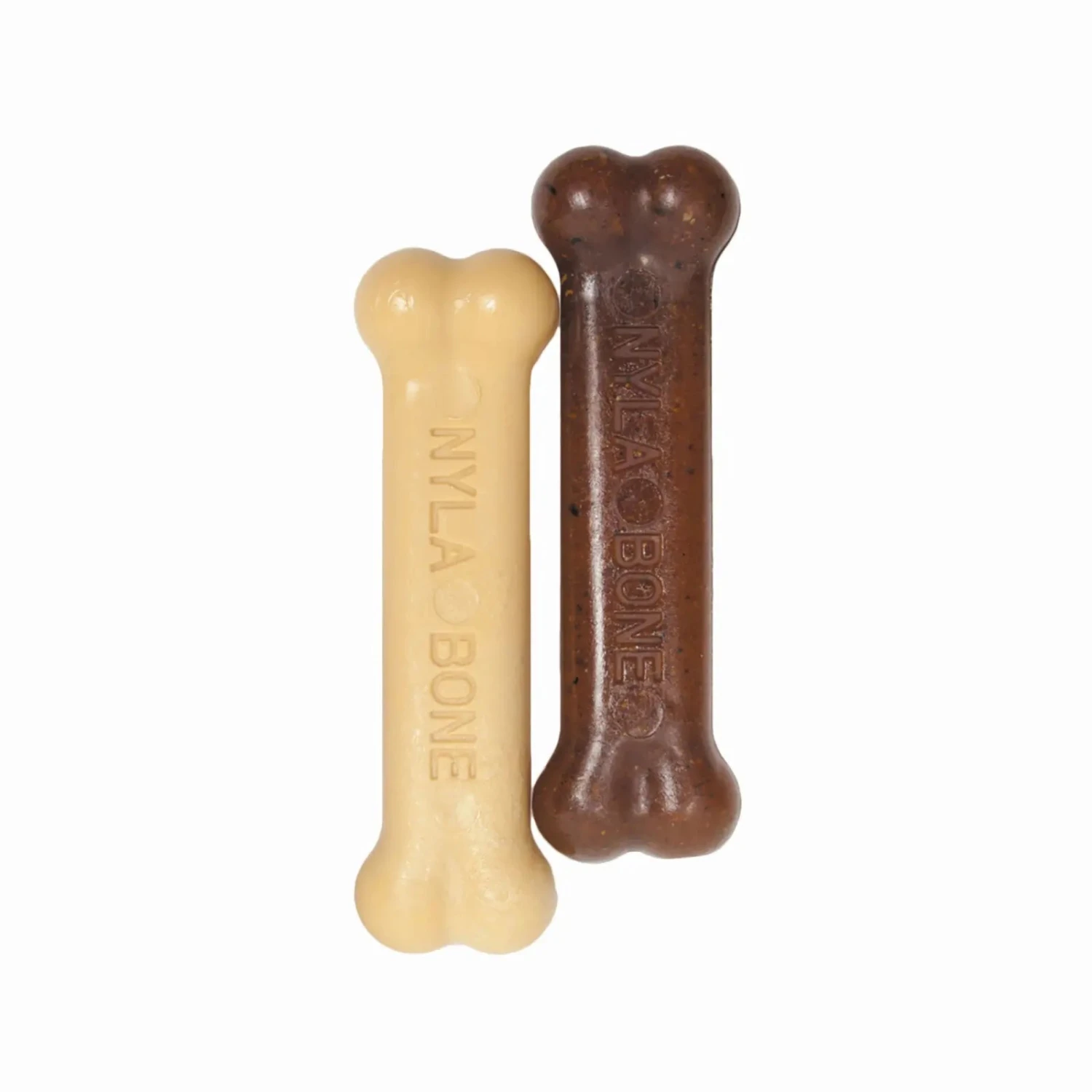 Encourage positive chewing habits from the start with our Peanut Butter and Chicken Chew Toy Twin Pack! Easy for the tiniest dogs to hold and carry, each long lasting chew toy is packed with flavour: one in yummy peanut butter and the other in irresistible chicken. Your puppy will love this sweet-and-savoury combo. These dog chew toys are made of softer, flexible material just for puppies! Plus, the bristles raised during chewing promote clean teeth and help control plaque and tartar build up. Start your teething puppy off right with our sturdy chew toys!