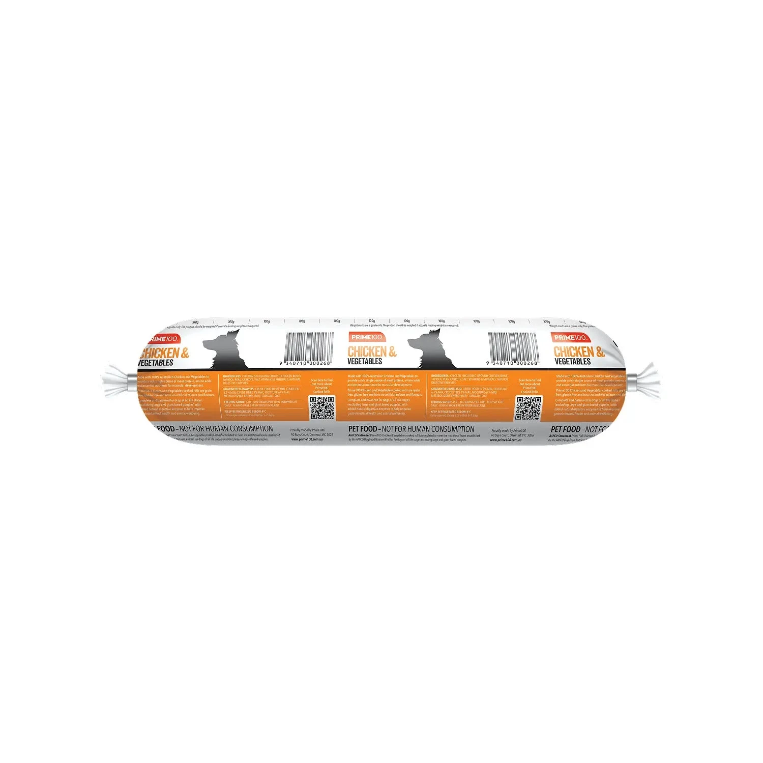 Prime100 Chicken & Vegetables cooked rolls are carefully blended, cooked and chilled to create a perfectly balanced, wholesome meal for dogs.