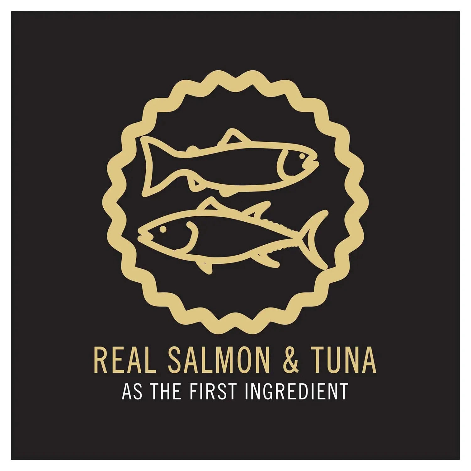 Ingredients: Salmon and tuna; dehydrated chicken; whole grain wheat; poultry oil; wheat protein; brewers rice; minerals, vitamins, amino acids, organic acids and flavours (including calcium, phosphorus, sodium, chloride, potassium, magnesium, manganese, copper, zinc, iron, iodine, selenium, vitamin A, vitamin B1, vitamin B2, vitamin B3, folic acid, vitamin B5, vitamin B6, vitamin B12, vitamin C, vitamin D, vitamin E, choline, methionine, taurine, pyrophosphates); corn protein; colostrum and natural antioxidants.