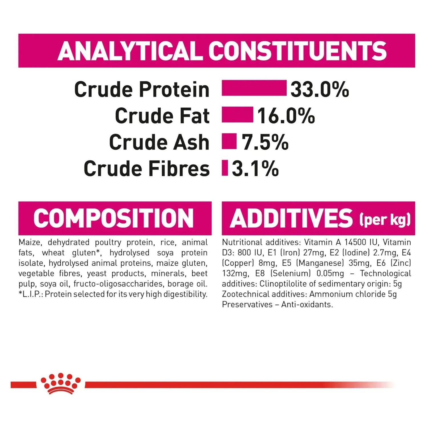 Ingredients: maize, dehydrated poultry protein, rice, vegetable protein isolate, animal fats, maize gluten, hydrolysed animal proteins, vegetable fibres, yeasts and parts thereof, minerals, beet pulp, soya oil, fructo-oligo-saccharides, borage oil.