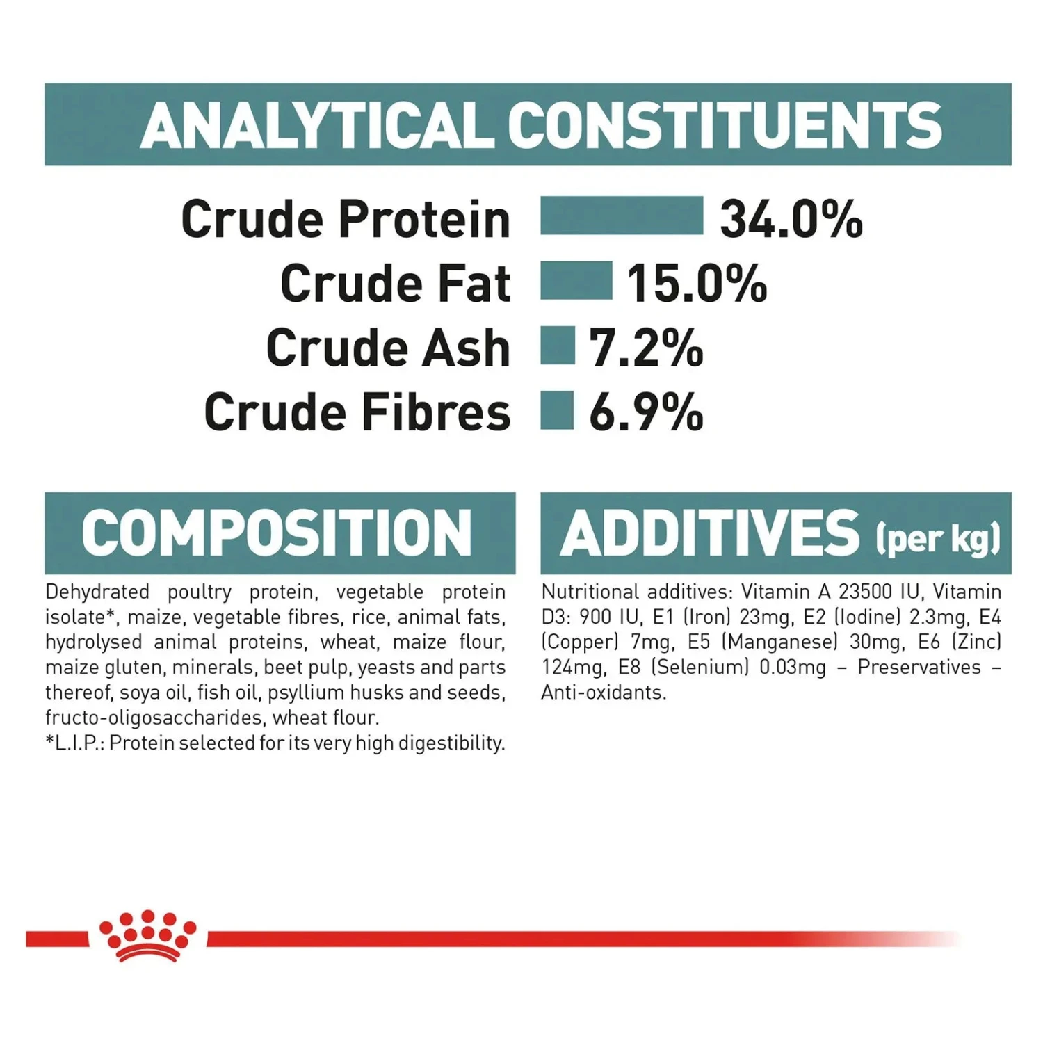 Royal Canin Hairball Care is composed of a specific blend of dietary fibres, including psyllium (rich in mucilage) and insoluble fibres to help naturally stimulate healthy intestinal transit. As a result, hair swallowed daily can be eliminated in its faeces rather than building up in the stomach and being regurgitated. Royal Canin Hairball Care contains a precise combination of nutrients with a high protein content (34%) and high fat content (15%) to ensure that a healthy level of nutrients is maintained effectively.