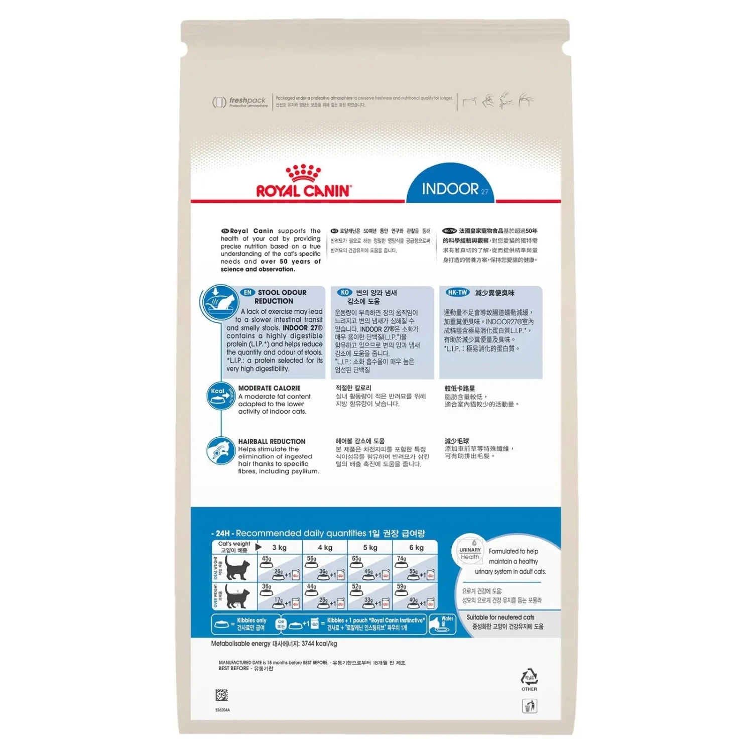 Indoor adult cats like yours tend to get less exercise than outdoor cats, that’s why a balanced and complete diet containing beneficial nutrients is important for optimal health. Royal Canin Indoor 27 contains a highly digestible protein (L.I.P.) that’s specifically selected for its very high digestibility. This protein also helps to reduce the quantity of your cat’s stool, as well as reducing the smelly stool odour that occurs when cats have a lower intestinal transit due to a lack of exercise.