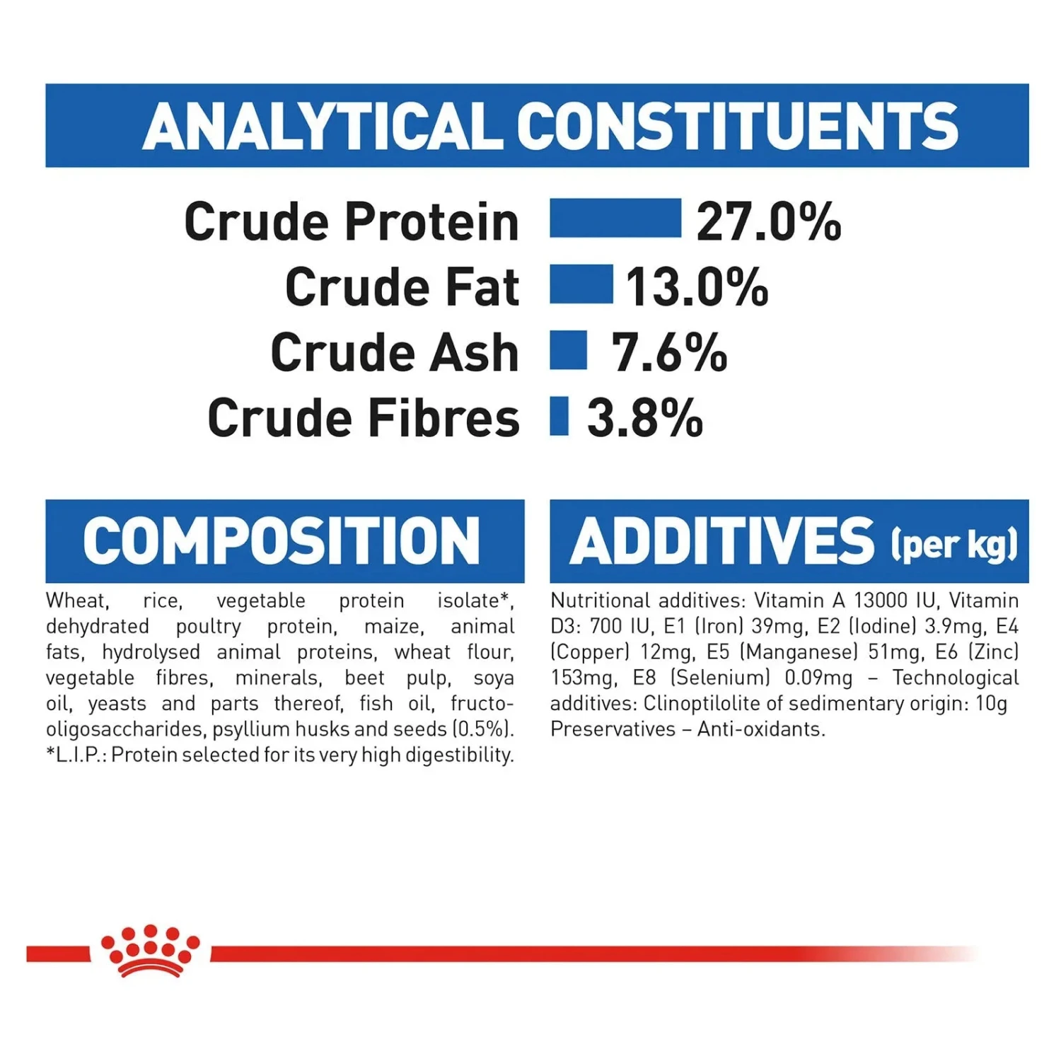 Ingredients:Â maize, dehydrated poultry protein, rice, vegetable protein isolate, wheat, animal fats, hydrolysed animal proteins, vegetable fibres, beet pulp, minerals, soya oil, fructo-oligo-saccharides, yeasts, fish oil.