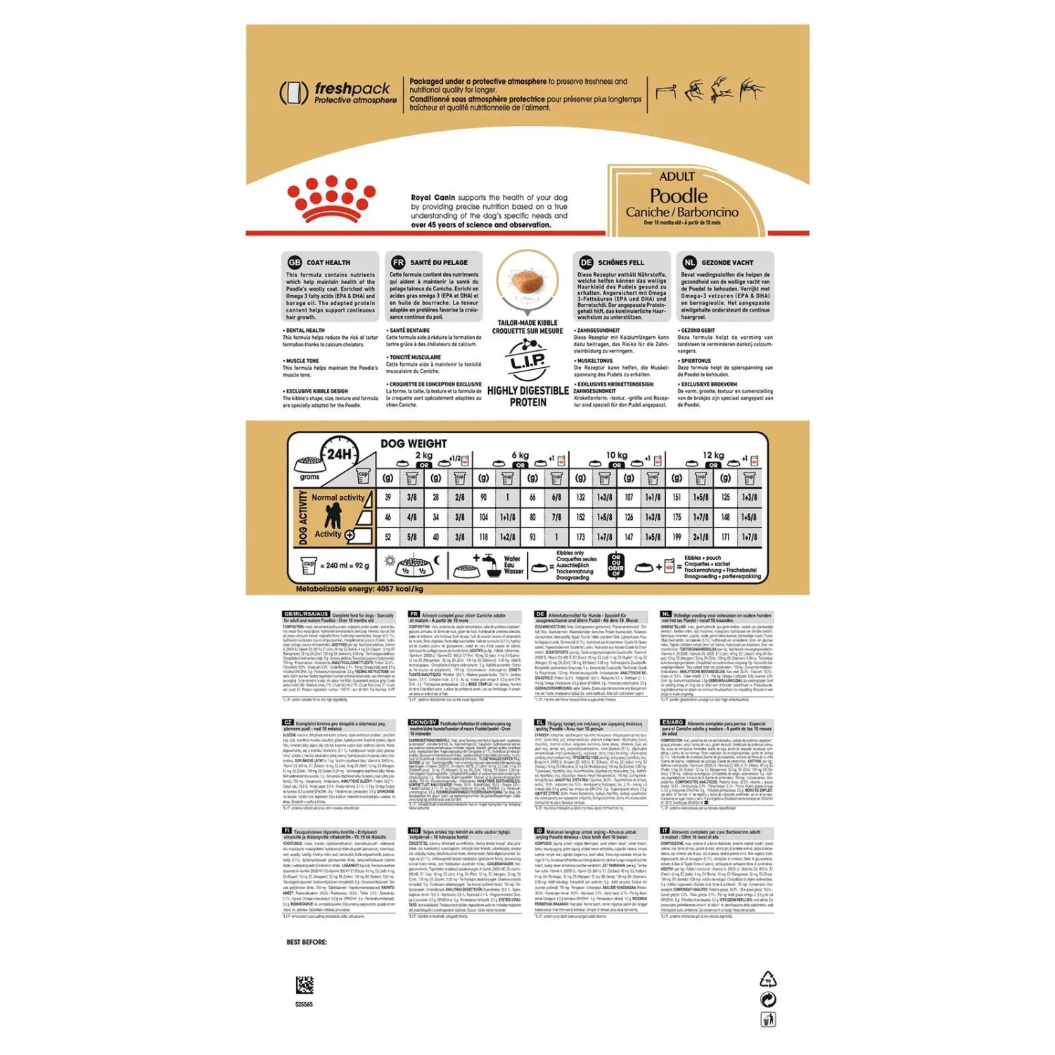 Royal Canin Poodle Adult contains omega-3 fatty acids such as EPA and DHA and borage oil. These nutrients – along with the specially adapted protein content – help to support the process of healthy hair growth. Thanks to the inclusion of calcium chelators, the kibble in Royal Canin Poodle Adult is exclusively designed to support your dog’s dental health by slowing down tartar formation and build-up. What’s more, this formula also helps to maintain your Poodle’s muscle tone.
