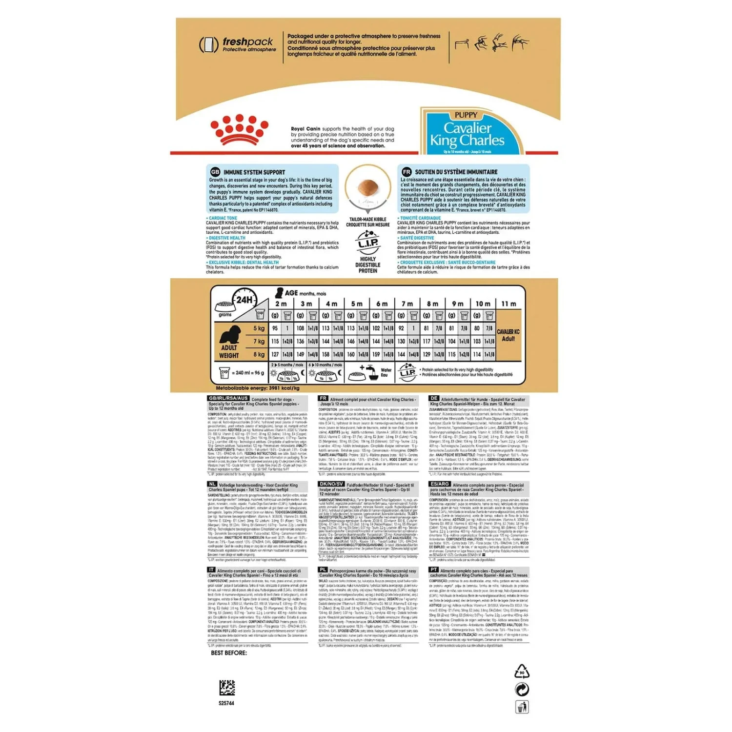 Enriched with Omega-3 fatty acids (EPA and DHA), as well as an adapted content of minerals, ROYAL CANIN® Cavalier King Charles Puppy contains all the nutrients necessary to help support healthy cardiac function. This formula contains a specific combination of nutrients with high quality protein (L.I.P.) specifically selected for its high digestibility.What’s more, ROYAL CANIN® Cavalier King Charles Puppy contains exclusive, tailor-made kibble. The exclusive formula contains a calcium chelator which helps to reduce the likelihood of tartar formation on your dog’s teeth and gums.