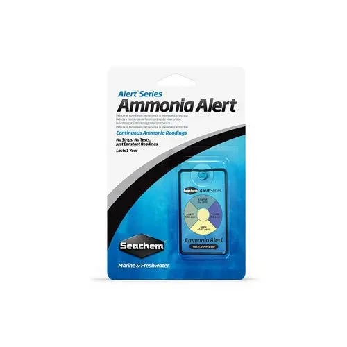 Ammonia Alert is an innovative color device for continuously detecting and monitoring toxic free ammonia. A sensor changes reversibly from yellow to green to blue, relative to the ammonia concentration. No test kits, chemicals, or procedures are needed. The device detects less than 0.05 mg/L (ppm) free ammonia and alerts you to the #1 killer before any sign of stress. It lasts over a year. Marine or freshwater use.