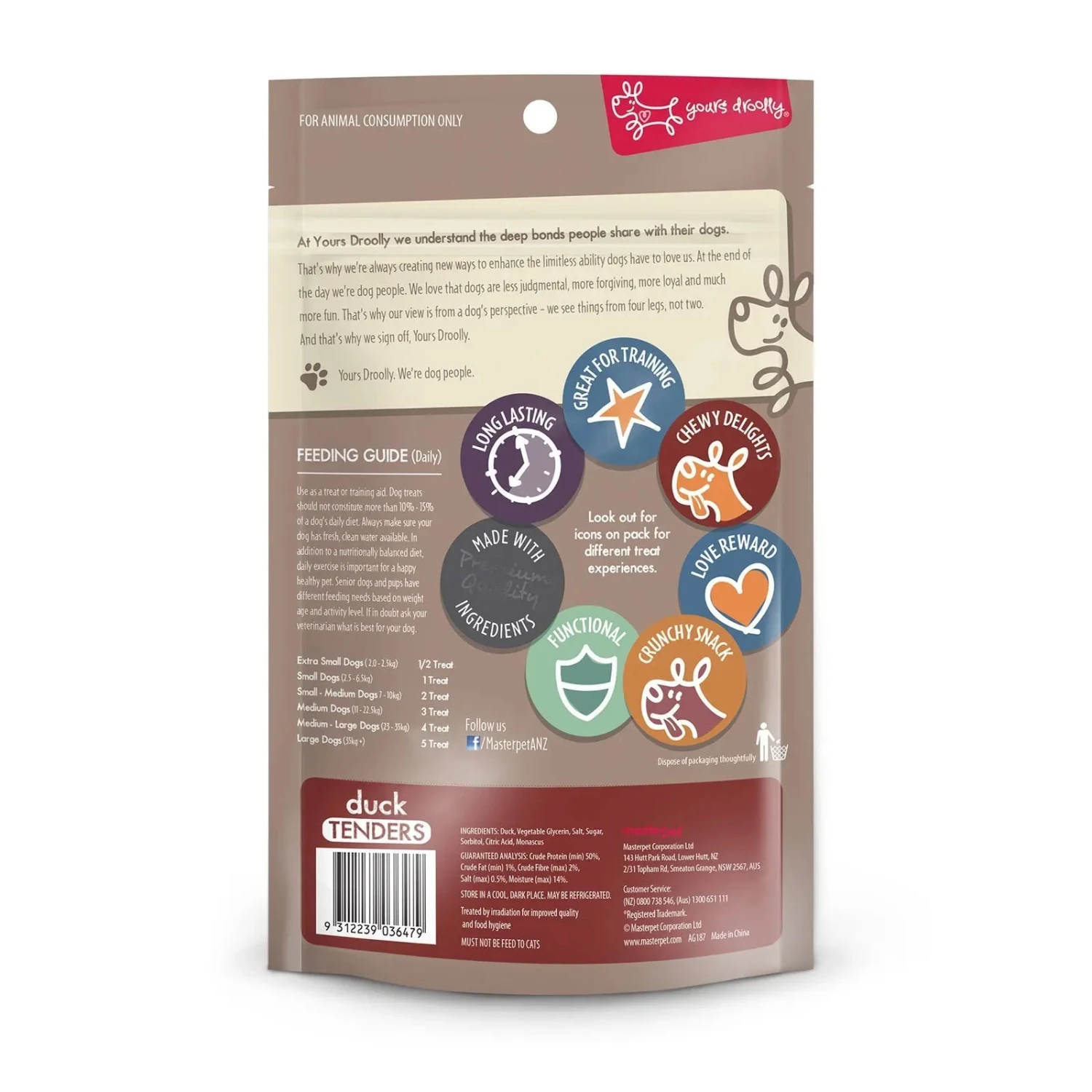 Yours Droolly Duck Tenders are a chewy treat, made from oven baked duck breast fillets. These strips of thin sliced duck are low in fat and high in protein.Â